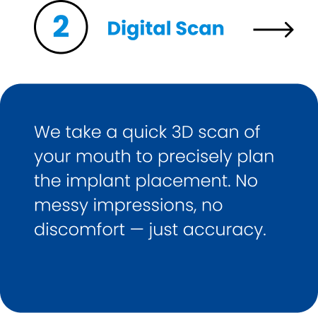 We take a quick 3D scan of your mouth to precisely plan the implant placement. No messy impressions, no discomfort — just accuracy.