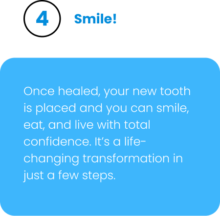 Once healed, your new tooth is placed and you can smile, eat, and live with total confidence. It’s a life-changing transformation in just a few steps.